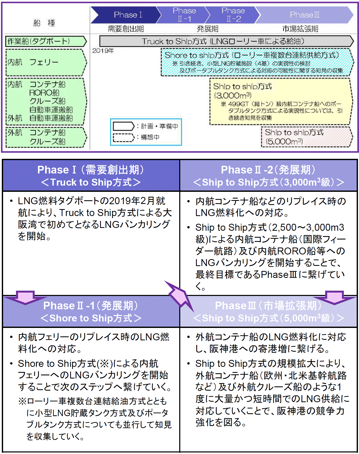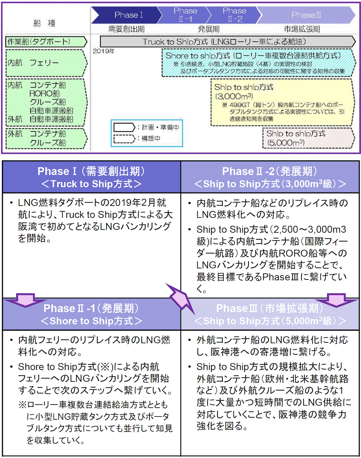 阪神港の競争力強化に向けて「阪神港におけるLNGバンカリング環境形成に向けた意見交換会(事務局 近畿地方整備局)」は、 LNGバンカリング環境の形成を促進させるため阪神港におけるロードマップをとりまとめるとともに、Shore to Ship方式の手引きを作成した。