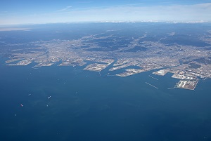 堺泉北港は、16世紀頃に南蛮貿易の拠点として栄えた堺港と、近年整備された泉北港を統合した、国際拠点港湾です。背後には大規模な堺泉北臨海工業地帯を有し、石油・化学・鉄鋼・金属などの工場や発電所、ガスの輸入基地などが立地しています。加えて、西日本における中古自動車の輸出拠点としても取扱貨物量は順調に推移しています。また、大規模地震発生時の災害応急活動の拠点として、2012年(平成24年)4月に堺2区基幹的広域防災拠点が供用開始しました。