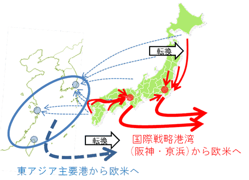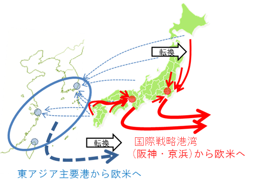 平成21年10月に設置された国土交通省成長戦略会議において、「海洋国家日本の復権」の一環として、アジア主要国と遜色のない港湾コスト・サービスの実現を目指すため、「選択」と「集中」に基づいた国際コンテナ戦略港湾の選定を行うこととし、平成22年8月、阪神港及び京浜港が国際コンテナ戦略港湾に選定されました。