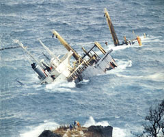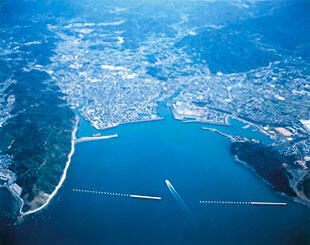柴山港の位置する日本海西部沿岸海域は、気象・海象条件が厳しく、以前から海難事故が多発していました。そこで、500~3,000G/Tの船舶を対象に、船舶が安全に避難することのできる「避難港」として柴山港を整備しています。避難水域を確保するため、水深約30mに「二重円筒ケーソン式防波堤」を設置し、この海域を通過する多くの船舶を守ります。