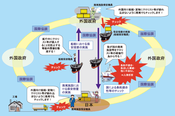 船舶所有者、港湾管理者等が保安の確保のために必要な対策を行うことにより、国際海上運送システムの信頼性の向上を図り、併せて急迫した脅威が認められる船舶の入港を拒否すること等により、国際海上輸送に係わる不法な行為の防止を図る。