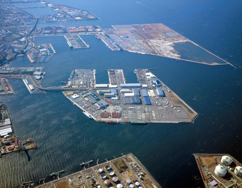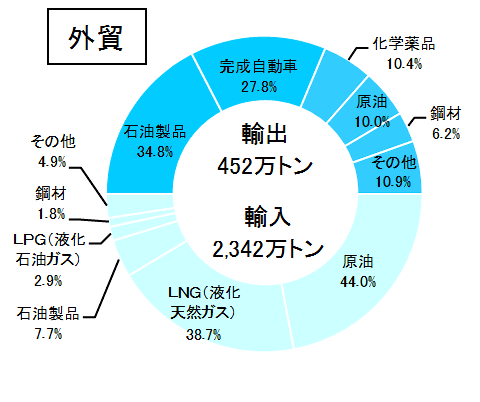 堺泉北港は、16世紀頃に南蛮貿易の拠点として栄えた堺港と、近年整備された泉北港を統合した、国際拠点港湾です。背後には大規模な堺泉北臨海工業地帯を有し、石油・化学・鉄鋼・金属などの工場や発電所、ガスの輸入基地などが立地しています。加えて、西日本における中古自動車の輸出拠点としても取扱貨物量は順調に推移しています。また、大規模地震発生時の災害応急活動の拠点として、2012年(平成24年)4月に堺2区基幹的広域防災拠点が供用開始しました。